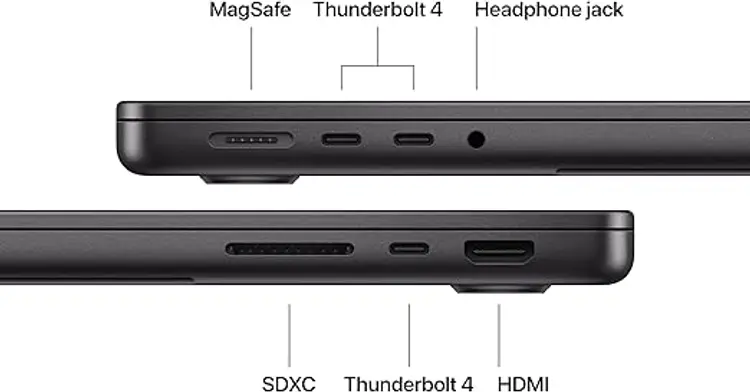 • Connectivity & Ports: Includes Thunderbolt (USB-C) ports, HDMI, SDXC card slot, MagSafe charging, headphone jack
