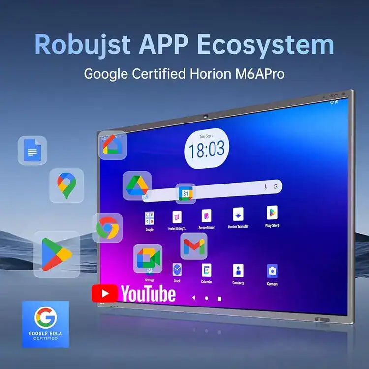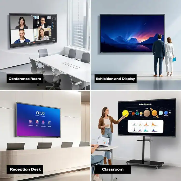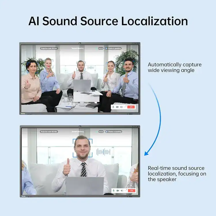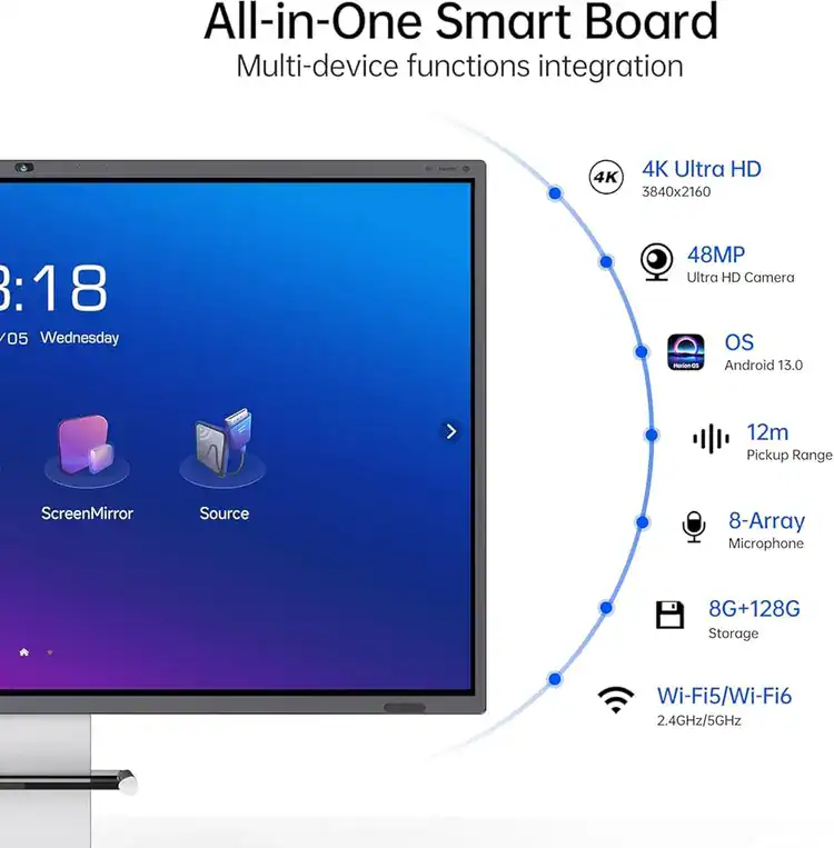Advanced video conferencing capabilities are enabled through a built-in 48MP ultra HD camera with intelligent framing and AI sound source localization. Audio clarity is ensured by an 8-array microphone system capable of capturing voices up to 12 meters away with a 180 degree pickup range, while a powerful 60W speaker system with integrated subwoofer provides rich sound output. Powered by Android 13 with a high-performance octa-core processor, ample memory, and modern wireless connectivity, the M6APro series integrates seamlessly with platforms such as Zoom and Microsoft Teams for efficient, one-click collaboration.