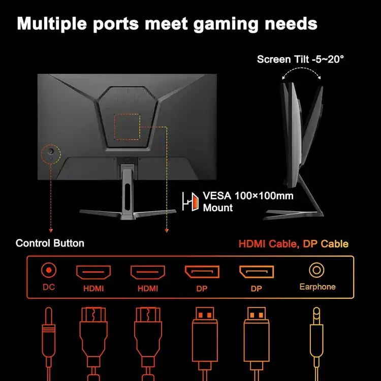 Future-ready connectivity: HDMI 2.1 and two DP 1.2 ports support 2K 120Hz monitor passthrough for consoles and PCs. The 100x100mm VESA mount enables ergonomic configurations, with -5° to 15° tilt for a perfect viewing angle.